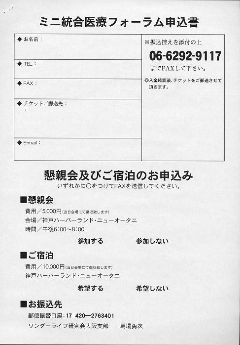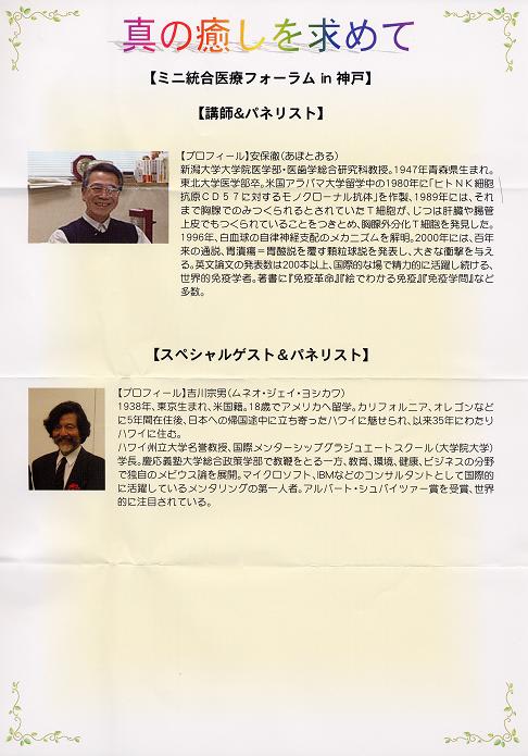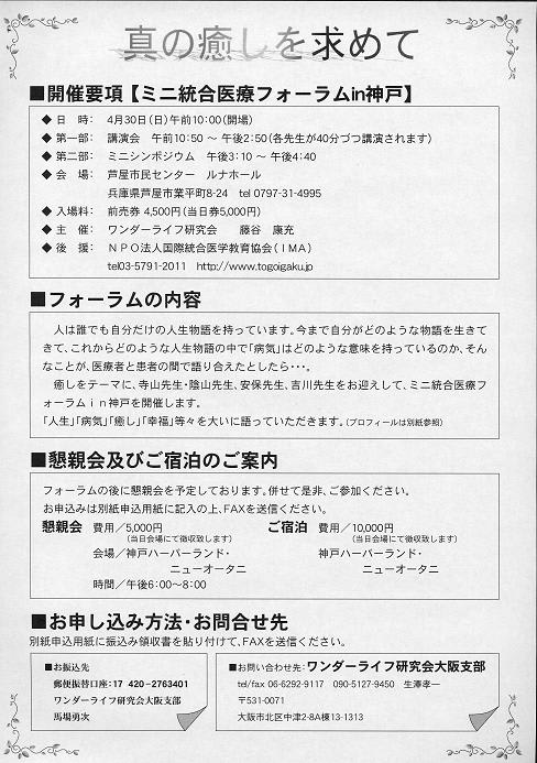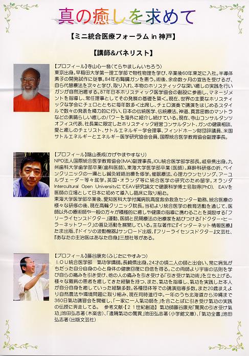 きょうは、2006年4月に神戸で開かれる、フォーラムについて、お伝えします。 先日、12月23日、熊野新宮にて開かれた引き受け氣功教室の際に藤谷康允先生の秘書の佐久間さんからいただいたものです。藤谷先生のワンダーライフ研究会が主催され、後援はNPO法人国際統合医学教育教会(IMA)です。弘祥は、新潟医大の安保徹先生以外とは、面識があります。それぞれに、すばらしい考えを持たれて、実践されている先生方です。共通するのは統合医療というものが根底にあります。弘祥も一会員のひとりです。