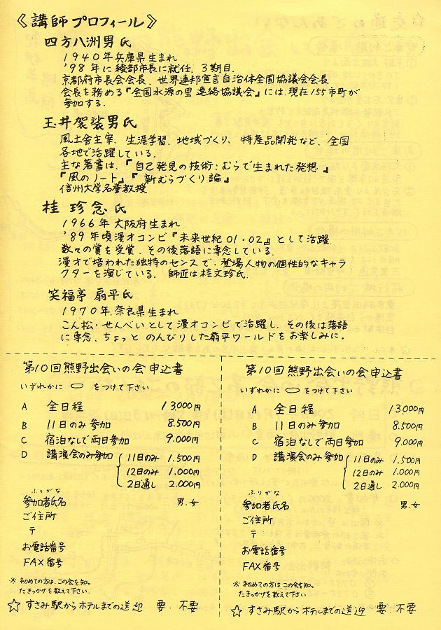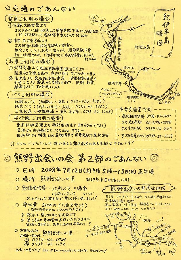 先日、弘祥が参加した、熊野であった催しを紹介いたします。名前を熊野出会いの会と言います。今年で第10回を数えます。主催者は、熊野出会いの里です。里長は大阪藤井寺ご出身で東京大学卒の方で日本の自然農法の走りと言われる麻野吉男氏です。自分は、過去に大阪の八尾の甲田医院の甲田光雄医師の講演会が熊野勝浦温泉で開催され出席させていただいた折りに知人のご紹介で麻野先生にお会いしたことがありました。その麻野先生が、自分の両親と親しかったそうで、実家の両親の所に遊びに来てくれた折りに当院を訪ねて来て下さいました。麻野先生と話す中、茨城の忍田 光先生とも20年前にお会いしたそうで、よく知っていらっしゃることや、他にもいろいろ話しをしました。先生は、「ギンヤンマが翔ぶ日 百姓が如雨露の穴から世の中見たら」という著書もあります。その話しの中で、熊野出会いの会の御案内をいただき、麻野先生から今までの参加の有無を聞かれまして「一度もありません。」とお答えしましたら「それでは、ぜひ今回は参加してもらわないと…」と誘われました。その際、「あなたは、診療があるやろうさかい2部にだけ参加してもらったら」と言う話しになりまして、それで弘祥のカヌー仲間で山登りやダイビングも一緒に出かけたりするアウトドア派の友人と出かけてまいりました。