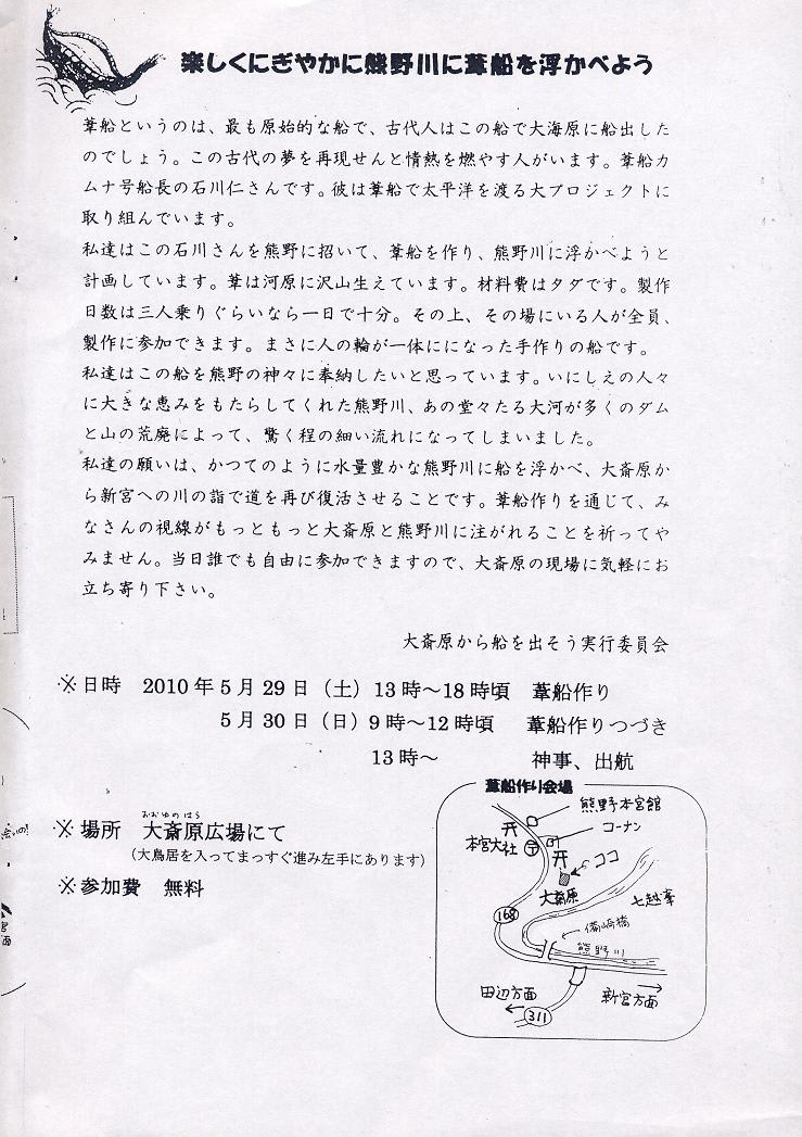 今年は、みんなで葦船を作り、熊野の神々に奉納して、神事の後実際に、乗船して熊野川を下るそうです。